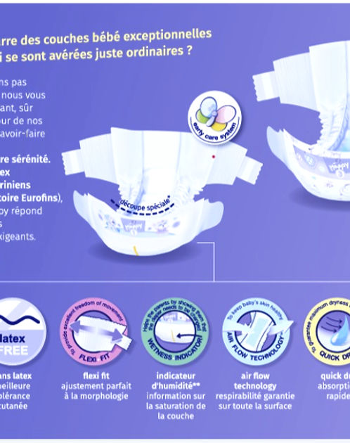 La qualité et la sécurité des couches Happy ont été confirmées par des tests dermatologiques. Les produits ont été également évalués de manière positive par l’Institut de la Mère et de l’Enfant et l’Institut National d’Hygiène.
