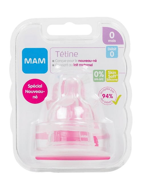 La Tétine Silicone Vitesse 0 Débit Extra Lent Mam, à la surface douce comme la soie et au toucher moelleux, est instinctivement adoptée par les bébés lors de la prise du biberon.